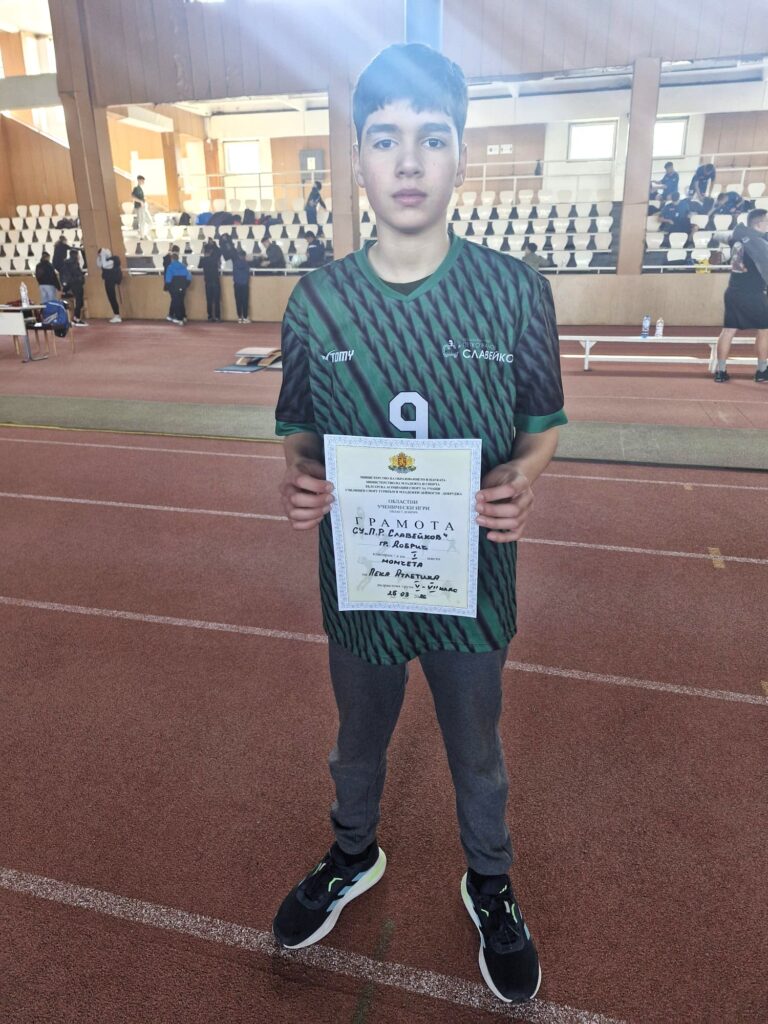 Отборът на СУ „П. Р. Славейков“, момчета 5-7 клас, зае първото място в областната надпревара по лека атлетика в рамките на Ученическите игри. Състезателите ни демонстрираха сила, издръжливост и висок спортен дух и заслужено грабнаха първенството. С много устрем, концентрация и желание за изява момчетата ни