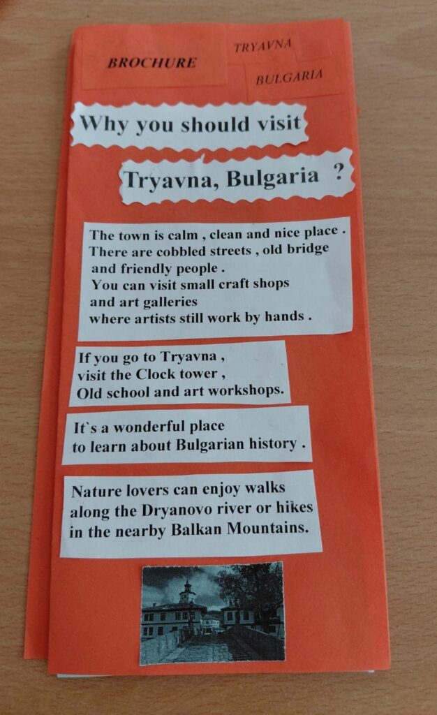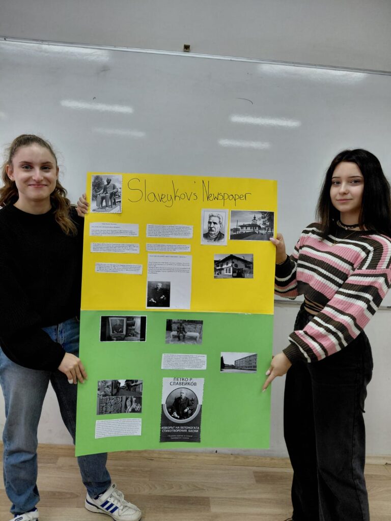 По повод патронния празник на СУ „Петко Рачов Славейков“ учениците от IX а и X а клас проведоха нестандартни и вдъхновяващи уроци по английски език, посветени на живота и делото на нашия патрон и на родния му град Търново. В рамките на инициативата деветокласниците влязоха в ролята на журналисти, които подготвят статия за училищния вестник на тема „Трявна – туристическа дестинация“. Петко Рачов Славейков е роден в Търново, но е учил в Трявна – красив възрожденски град, свързан с живота и семейството му. Затова учениците избраха именно това място, вдъхновени от неговата история и атмосфера. Те изследваха културните и историческите богатства на града и се запознаха с неповторимата му възрожденска архитектура. Изработиха брошура с образци на тревненската архитектура и емблематични места от времето на Възраждането, представяйки я на английски език. С усет и любопитство те показаха, че родният край може да бъде вдъхновение и гордост за всеки българин.