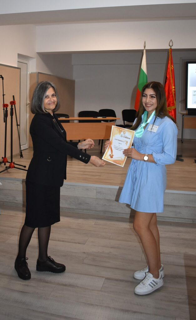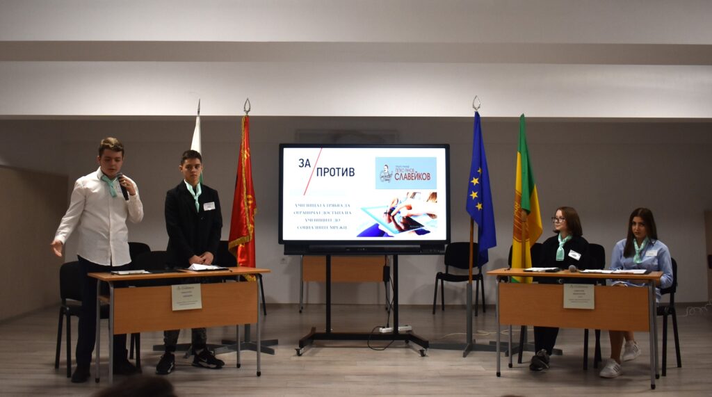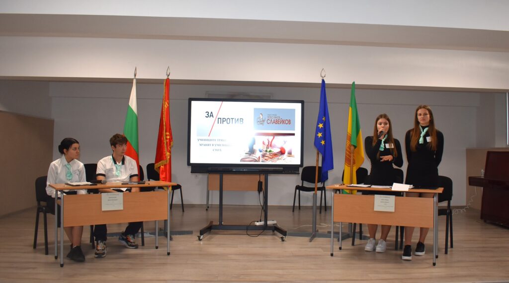 Във връзка с честването на Патронния празник на училището, учениците от 11 и 12 клас на СУ „П. Р. Славейков“ организираха поредния училищен дебат. На фокус бяха въпроси, които вълнуват тийнейджърите – ограничаване на достъпа до социалните мрежи в училище и храненето в училищния стол. Успешно и емоционално беше участието на 4 отбора от по двама състезатели, които дискутираха по избраните теми - Божидар Киров и Давид Велков, защитаващи тезата ЗА „Училищата трябва да ограничат достъпа на учениците до социалните мрежи“ и техни опоненти, подкрепящи тезата ПРОТИВ - Силвия Колева и Емилия Ангелова. Другата важна теза - ЗА „Учениците трябва да се хранят в училищния стол“, подкрепяха Кремена Колева и Филип Александров, а на срещуположното мнение бяха Сияна Стоянова и Аделина Борисова. Всички участници демонстрираха сериозни умения в дебатирането и аргументирано опровергаваха опонентите си. Убедително и с много примери бяха развити изложенията, а репликите и заключенията показаха завидна съобразителност и креативност. Дебатът премина в изключително позитивна атмосфера и всички, независимо от позицията си, демонстрираха толерантност и разбиране към различното мнение. Впечатление правеха отличната комуникация при отборната работа, както и добре подбраните по важност акценти. Публиката и специалните гости на формата, учениците от 7 а клас, бурно аплодираше добре защитените мнения и емоционалното им представяне. Специално жури от преподаватели отличи най-добре представилите се. Първа награда получиха Емилия Ангелова и Кремена Колева, втора награда – Сияна Стоянова и Божидар Киров, а останалите участници - грамоти за участие. Дебатите развиват ценни умения, свързани с публичното говорене и критичното мислене, изграждат нагласи за оценяване и разбиране на различните гледни точки и помагат на младите хора в себеизразяването и себеутвърждаването. Надяваме се, тази добра традиция в нашето училище да продължи и в бъдеще.
