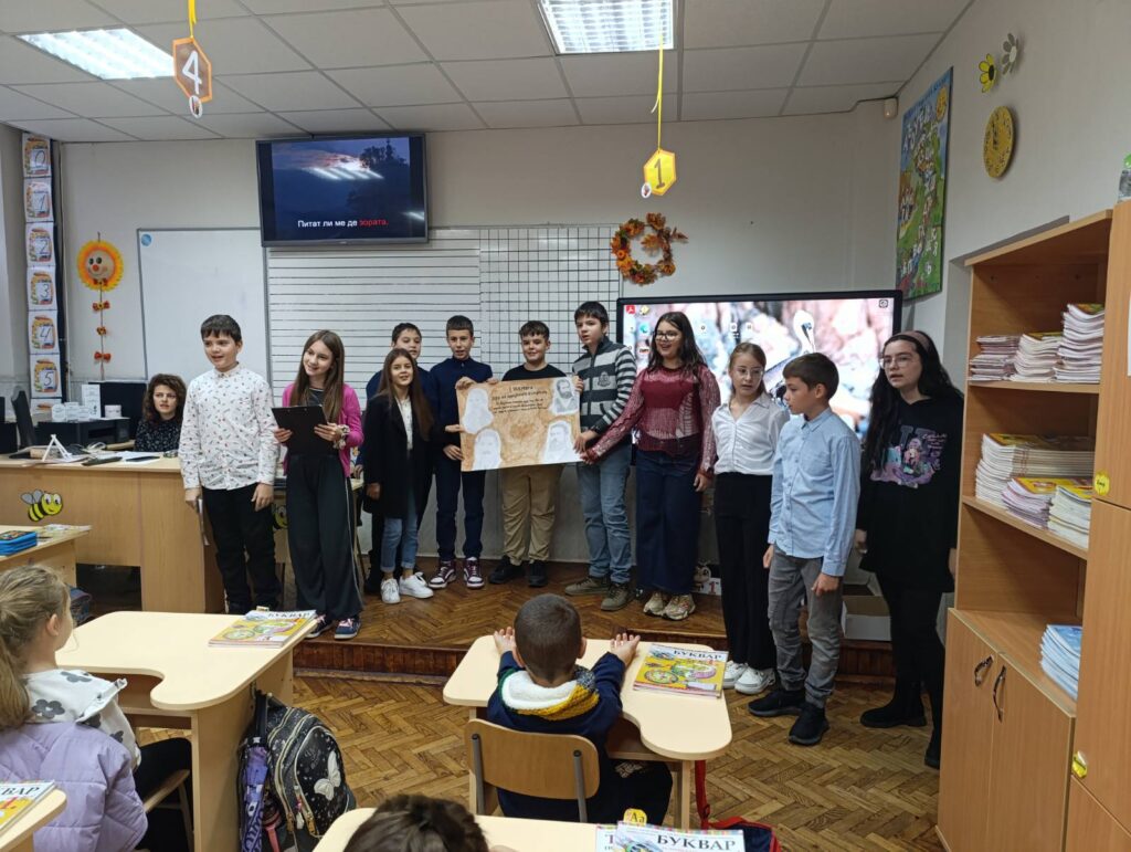 Учениците от VI a клас, с класен ръководител Атанаска Димитрова-Илиева, поздравиха своите по-малки Славейкови следовници от I а клас с вълнуващ рецитал, в който прозвучаха светли стихове и възрожденски песни. Най-емоционалният и топъл момент настъпи, когато първокласници и шестокласници запяха заедно песента „Де е България?“ – символ на сплотеността на децата и обичта им към родината. Шестокласниците поднесоха и специална изненада – красив плакат с портрети на народните будители и вдъхновяващи слова за празника, изработен с много старание и топлота. Плакатът „оживя“ в ръцете на децата, и малки, и големи споделиха с трепет какво знаят за Петко Рачов Славейков, Иван Вазов, Христо Ботев и Любен Каравелов.