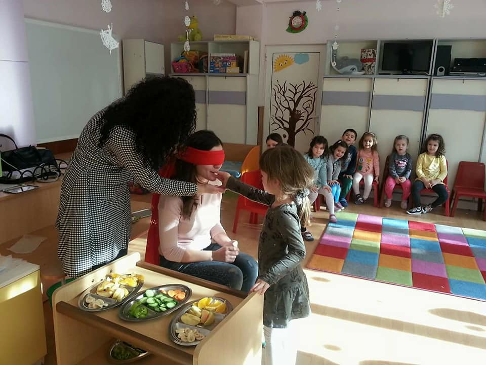 Срещата продължи с игри и забавления между малки и големи. Първата игра бе щафетата „Бързият готвач”. Децата бяха разделени на три отбора. Всеки участник трябваше да избере само здравословен продукт, да го отнесе при отбора и да предаде щафетата на следващия. В следващата игра и малки, и големи трябваше да познаят със завързани очи какъв продукт хапват – плод или зеленчук, както и да назоват името му. Децата се справиха отлично и вярно познаха банан, ябълка, портокал, краставица, пиперка и морков.