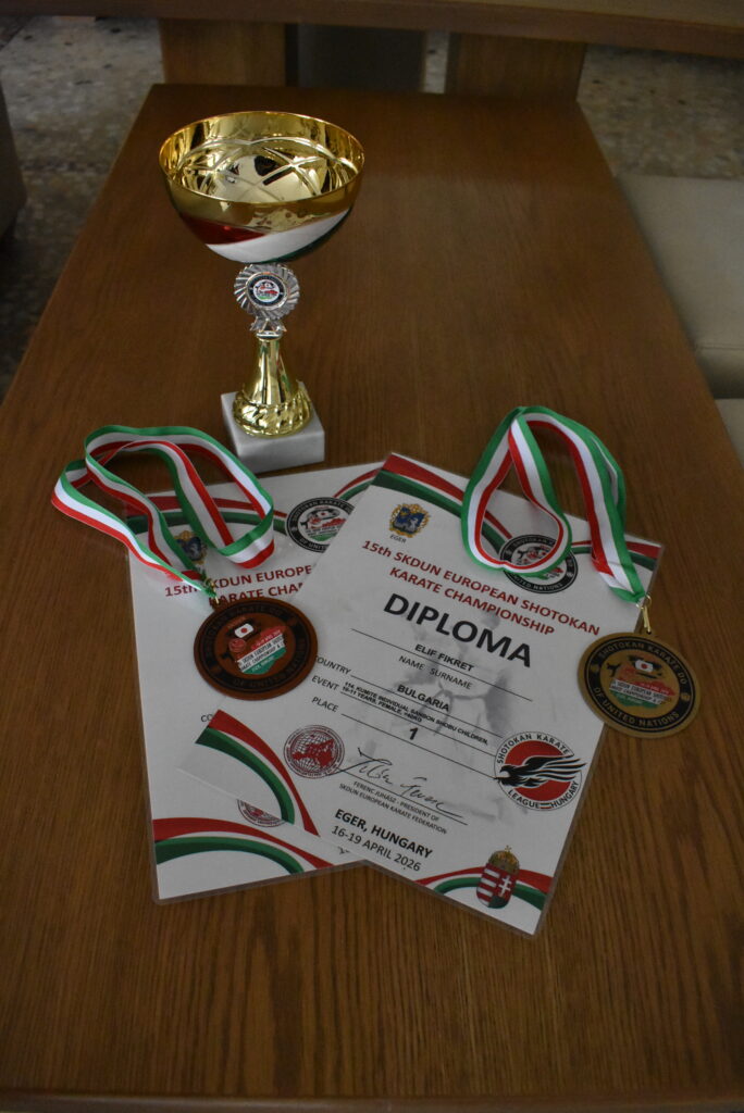 С огромна гордост и радост споделяме изключителния успех на Елиф Фикрет от 5 а клас! На провелото се неотдавна 15-о Европейско първенство по Шотокан карате в град Егер, Унгария, тя демонстрира непоколебим дух и завоюва европейската титла при момичетата (10–11 години) в категория + 40 кг. В престижната надпревара участваха над 1000 състезатели от 27 държави. При изключително сериозна конкуренция нашето момиче показа отлична техническа подготовка и издръжливост в поредица от оспорвани спаринг срещи. Към златния медал Елиф добави и бронзово отличие в престижната „отворена“ категория, доказвайки, че е сред най-добрите каратеки на континента. Пътят ѝ в спорта започва преди 4 години, когато чистото любопитство я отвежда на една от тренировките на нейния брат. Днес състезателката на карате клуб „Добруджа“ вече е натрупала впечатляваща колекция от награди: двукратен държавен шампион, трета на Балканско първенство, носител на множество отличия от международни турнири. Нейните големи примери в спорта са Ивет Горанова и Мохамед Ал-Джафари. Освен отдаден спортист, Елиф е и отлична ученичка, която с лекота съчетава залата с учебниците. Любимите ѝ предмети са математика, български език и литература, история и английски език. Нейният триумф е плод на много труд, дисциплина и любов към всичко, с което се занимава.